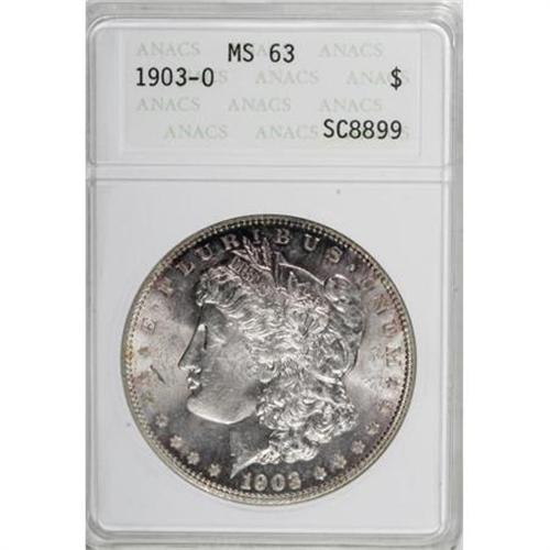 <B>1903-O $1 MS63 ANACS.</B></I> NGC Census: (923/3285). PCGS Population (2260/5485). Mintage: 4,450,000. Numismedia Wsl. Price for NGC/PCGS coin in MS63: $367. (#7286)<BR><BR><B>Coin Engraver:</B> George T. Morgan<BR><BR><b>Shipping:</b> Coins & Currency (<a target="_blank" href="http://www.heritageauctions.com/common/shipping.php">view shipping information</a>)