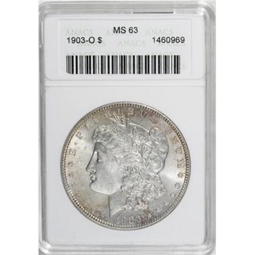<B>1903-O $1 MS63 ANACS.</B></I> . NGC Census: (957/3354). PCGS Population (2298/5578). Mintage: 4,450,000. Numismedia Wsl. Price for NGC/PCGS coin in MS63: $367. (#7286)<BR><BR><B>Coin Engraver:</B> George T. Morgan<BR><BR><b>Shipping:</b> Coins & Currency (<a target="_blank" href="http://www.heritageauctions.com/common/shipping.php">view shipping information</a>)