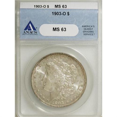 <B>1903-O $1 MS63 ANACS.</B></I> . NGC Census: (959/3361). PCGS Population (2302/5592). Mintage: 4,450,000. Numismedia Wsl. Price for NGC/PCGS coin in MS63: $367. (#7286)<BR><BR><B>Coin Engraver:</B> George T. Morgan<BR><BR><b>Shipping:</b> Coins & Currency (<a target="_blank" href="http://www.heritageauctions.com/common/shipping.php">view shipping information</a>)