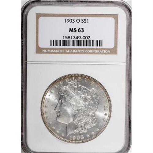 <B>1903-O $1 MS63 NGC.</B></I> NGC Census: (945/3326). PCGS Population (2279/5539). Mintage: 4,450,000. Numismedia Wsl. Price for NGC/PCGS coin in MS63: $367. (#7286)<BR><BR><B>Coin Engraver:</B> George T. Morgan<BR><BR><b>Shipping:</b> Coins & Currency (<a target="_blank" href="http://www.heritageauctions.com/common/shipping.php">view shipping information</a>)