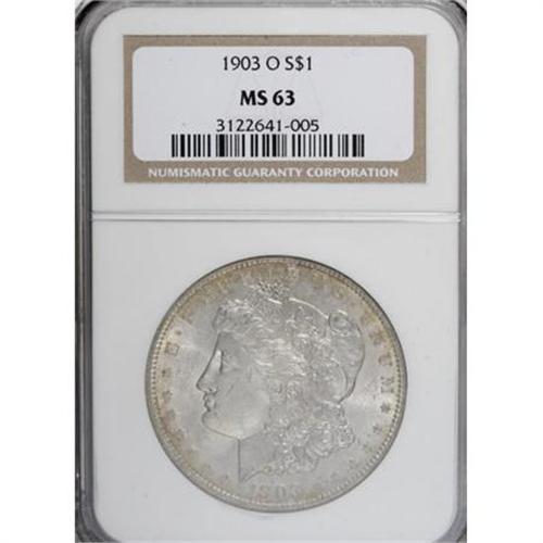 <B>1903-O $1 MS63 NGC.</B></I> . NGC Census: (958/3357). PCGS Population (2298/5578). Mintage: 4,450,000. Numismedia Wsl. Price for NGC/PCGS coin in MS63: $367. (#7286)<BR><BR><B>Coin Engraver:</B> George T. Morgan<BR><BR><b>Shipping:</b> Coins & Currency (<a target="_blank" href="http://www.heritageauctions.com/common/shipping.php">view shipping information</a>)