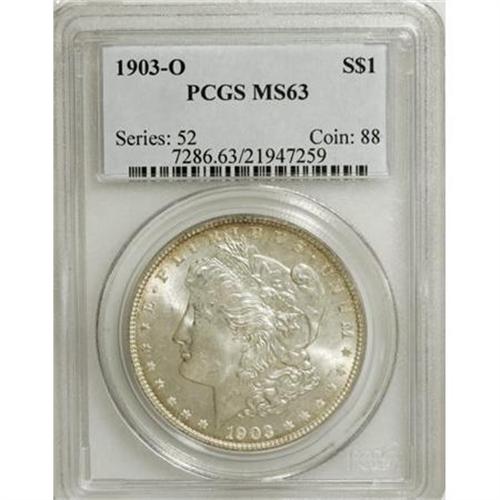 <B>1903-O $1 MS63 PCGS.</B></I> PCGS Population (2227/5381). NGC Census: (911/3251). Mintage: 4,450,000. Numismedia Wsl. Price for NGC/PCGS coin in MS63: $367. (#7286)<BR><BR><B>Coin Engraver:</B> George T. Morgan<BR><BR><b>Shipping:</b> Coins & Currency (<a target="_blank" href="http://www.heritageauctions.com/common/shipping.php">view shipping information</a>)
