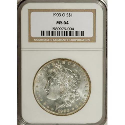 <B>1903-O $1 MS64 NGC.</B></I> NGC Census: (1871/1408). PCGS Population (3228/2225). Mintage: 4,450,000. Numismedia Wsl. Price for NGC/PCGS coin in MS64: $400. (#7286)<BR><BR><B>Coin Engraver:</B> George T. Morgan<BR><BR><b>Shipping:</b> Coins & Currency (<a target="_blank" href="http://www.heritageauctions.com/common/shipping.php">view shipping information</a>)