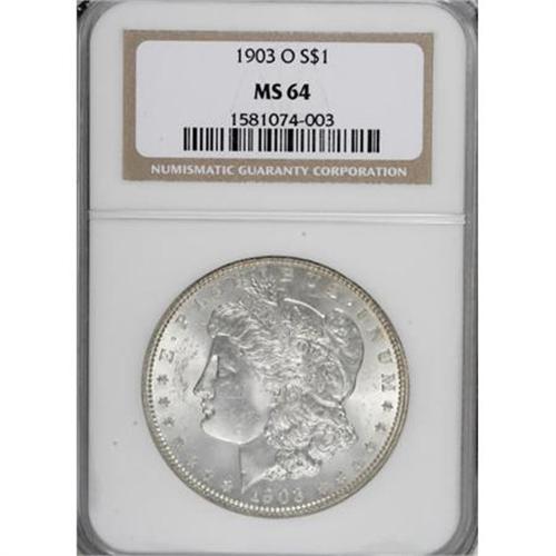 <B>1903-O $1 MS64 NGC.</B></I> NGC Census: (1875/1410). PCGS Population (3240/2240). Mintage: 4,450,000. Numismedia Wsl. Price for NGC/PCGS coin in MS64: $400. (#7286)<BR><BR><B>Coin Engraver:</B> George T. Morgan<BR><BR><b>Shipping:</b> Coins & Currency (<a target="_blank" href="http://www.heritageauctions.com/common/shipping.php">view shipping information</a>)