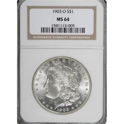 <B>1903-O $1 MS64 NGC.</B></I> NGC Census: (1875/1410). PCGS Population (3244/2247). Mintage: 4,450,000. Numismedia Wsl. Price for NGC/PCGS coin in MS64: $400. (#7286)<BR><BR><B>Coin Engraver:</B> George T. Morgan<BR><BR><b>Shipping:</b> Coins & Currency (<a target="_blank" href="http://www.heritageauctions.com/common/shipping.php">view shipping information</a>)