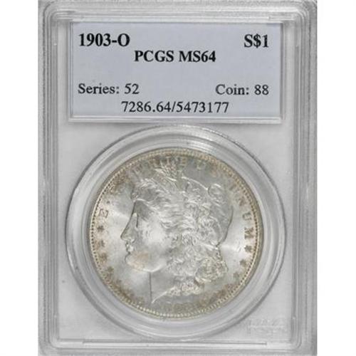 <B>1903-O $1 MS64 PCGS.</B></I> PCGS Population (3240/2240). NGC Census: (1875/1410). Mintage: 4,450,000. Numismedia Wsl. Price for NGC/PCGS coin in MS64: $400. (#7286)<BR><BR><B>Coin Engraver:</B> George T. Morgan<BR><BR><b>Shipping:</b> Coins & Currency (<a target="_blank" href="http://www.heritageauctions.com/common/shipping.php">view shipping information</a>)