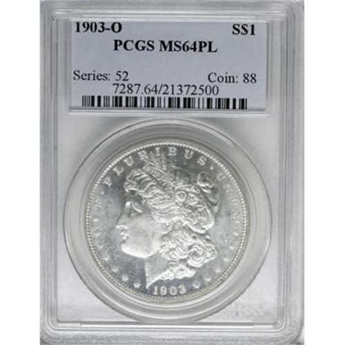 <B>1903-O $1 MS64 Prooflike PCGS.</B></I> 1903-O dollars are quite plentiful through the MS65 grade level, as evidenced by the thousands certified by PCGS and NGC. Prooflike specimens are another story, as can be seen from the PCGS population data below. Moreover, this near-Gem Prooflike coin displays strong definition, rather unusual for this New Orleans issue. Highly lustrous surfaces are just a couple of minuscule marks from full Gem classification. Population: 42 in 64 Prooflike, 20 finer (10/07).<BR><BR><B>Coin Engraver:</B> George T. Morgan<BR><BR><b>Shipping:</b> Coins & Currency (<a target="_blank" href="http://www.heritageauctions.com/common/shipping.php">view shipping information</a>)