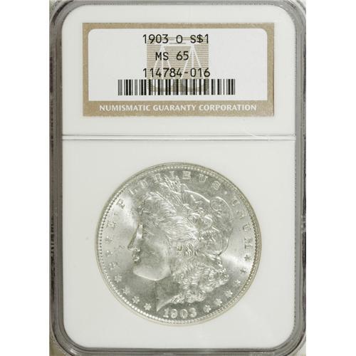 <B>1903-O $1 MS65 NGC.</B></I> NGC Census: (1074/309). PCGS Population (1689/517). Mintage: 4,450,000. Numismedia Wsl. Price for NGC/PCGS coin in MS65: $540. (#7286)<BR><BR><b>Shipping:</b> Coins & Currency (<a target="_blank" href="http://www.heritageauctions.com/common/shipping.php">view shipping information</a>)