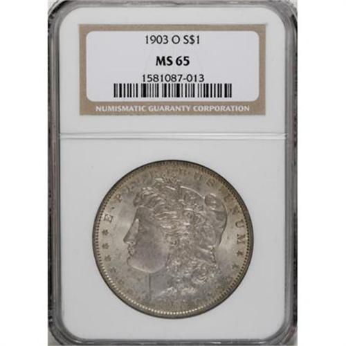 <B>1903-O $1 MS65 NGC.</B></I> The shining obverse surfaces of this O-mint Gem display subtle pink and peach accents, while the reverse is more vibrant with the colors dominant. Pleasingly detailed for the issue and attractive.<BR><BR><B>Coin Engraver:</B> George T. Morgan<BR><BR><b>Shipping:</b> Coins & Currency (<a target="_blank" href="http://www.heritageauctions.com/common/shipping.php">view shipping information</a>)
