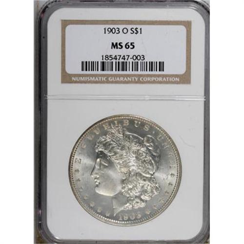 <B>1903-O $1 MS65 NGC.</B></I> NGC Census: (1091/319). PCGS Population (1706/530). Mintage: 4,450,000. Numismedia Wsl. Price for NGC/PCGS coin in MS65: $560. (#7286)<BR><BR><B>Coin Engraver:</B> George T. Morgan<BR><BR><b>Shipping:</b> Coins & Currency (<a target="_blank" href="http://www.heritageauctions.com/common/shipping.php">view shipping information</a>)