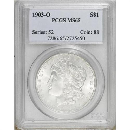 <B>1903-O $1 MS65 PCGS.</B></I> PCGS Population (1730/535). NGC Census: (1110/317). Mintage: 4,450,000. Numismedia Wsl. Price for NGC/PCGS coin in MS65: $550. (#7286)<BR><BR><B>Coin Engraver:</B> George T. Morgan<BR><BR><b>Shipping:</b> Coins & Currency (<a target="_blank" href="http://www.heritageauctions.com/common/shipping.php">view shipping information</a>)