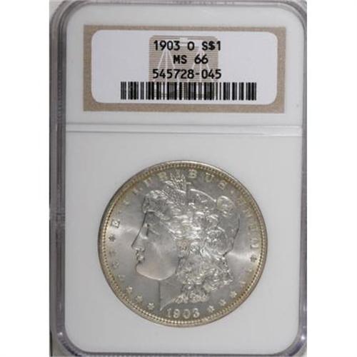 <B>1903-O $1 MS66 NGC.</B></I> Light gold patina hugs the borders of this Premium Gem, and a sharp strike brings out strong definition on the devices. Highly lustrous surfaces are minimally abraded.<BR><BR><B>Coin Engraver:</B> George T. Morgan<BR><BR><b>Shipping:</b> Coins & Currency (<a target="_blank" href="http://www.heritageauctions.com/common/shipping.php">view shipping information</a>)