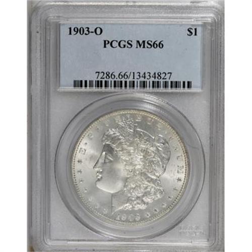 <B>1903-O $1 MS66 PCGS.</B></I> PCGS Population (482/54). NGC Census: (284/35). Mintage: 4,450,000. Numismedia Wsl. Price for NGC/PCGS coin in MS66: $775. (#7286)<BR><BR><B>Coin Engraver:</B> George T. Morgan<BR><BR><b>Shipping:</b> Coins & Currency (<a target="_blank" href="http://www.heritageauctions.com/common/shipping.php">view shipping information</a>)