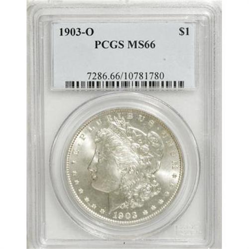 <B>1903-O $1 MS66 PCGS.</B></I> Bright and flashy, with light gold toning and well struck design elements. This New Orleans issue is scarce at MS66, and rare any finer. <BR> <BR><BR><B>Coin Engraver:</B> George T. Morgan<BR><BR><b>Shipping:</b> Coins & Currency (<a target="_blank" href="http://www.heritageauctions.com/common/shipping.php">view shipping information</a>)