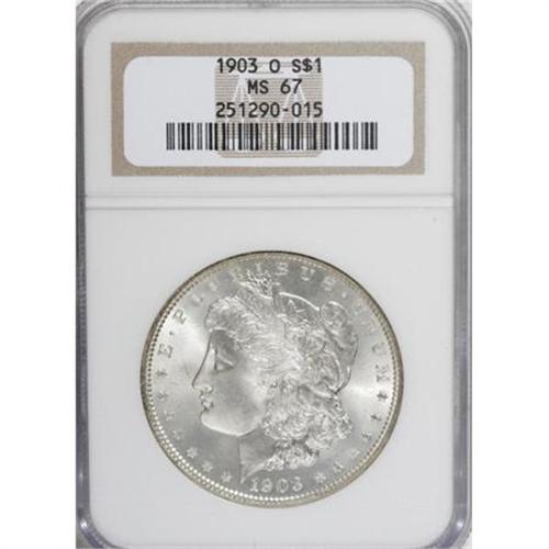 <B>1903-O $1 MS67 NGC.</B></I> The 1903-O had a mintage of 4.450 million pieces, but David Bowers (1906)estimates that 4 million were melted under the terms of the 1918 Pittman Act. This Superb Gem displays excellent design definition, including that on the strands of Liberty's hair and the feathers on the eagle's breast. Close examination exhibits wisps of faint tan-gold color at the margins. Census: 34 in 67, 0 finer (6/07).<BR><I>From the Reuben Reinstein Collection.</B></I><BR><BR><b>Shipping:</b> Coins & Currency (<a target="_blank" href="http://www.heritageauctions.com/common/shipping.php">view shipping information</a>)