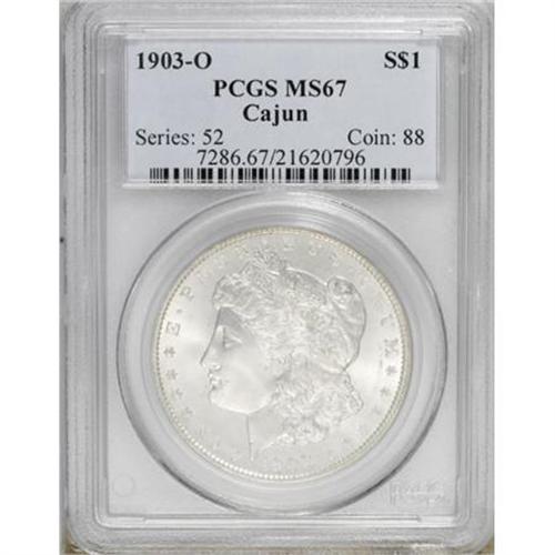 <B>1903-O $1 MS67 PCGS. CAC.</B></I> Ex: Cajun Collection. Creamy-white and intensely lustrous, this is a beautiful Superb Gem Morgan dollar from early in the 20th century. Crisply struck throughout, with excellent details noted above Liberty's ear and on the eagle's breast feathers, this example is also carefully preserved and free of distractions. Population: 54 in 67, 0 finer (11/07). <BR><BR><B>Coin Engraver:</B> George T. Morgan<BR><BR><b>Shipping:</b> Coins & Currency (<a target="_blank" href="http://www.heritageauctions.com/common/shipping.php">view shipping information</a>)