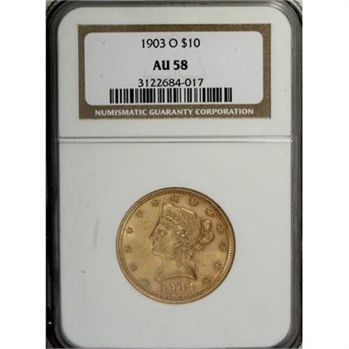 <B>1903-O $10 AU58 NGC.</B></I> . NGC Census: (204/629). PCGS Population (139/594). Mintage: 112,771. Numismedia Wsl. Price for NGC/PCGS coin in AU58: $446. (#8753)<BR><BR><B>Coin Engraver:</B> Christian Gobrecht<BR><BR><b>Shipping:</b> Coins & Currency (<a target="_blank" href="http://www.heritageauctions.com/common/shipping.php">view shipping information</a>)
