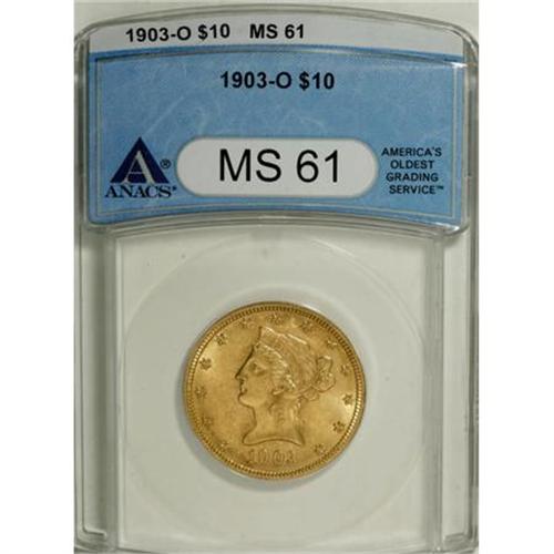 <B>1903-O $10 MS61 ANACS.</B></I> NGC Census: (264/275). PCGS Population (156/353). Mintage: 112,771. Numismedia Wsl. Price for NGC/PCGS coin in MS61: $375. (#8753)<BR><BR><B>Coin Engraver:</B> Christian Gobrecht<BR><BR><b>Shipping:</b> Coins & Currency (<a target="_blank" href="http://www.heritageauctions.com/common/shipping.php">view shipping information</a>)