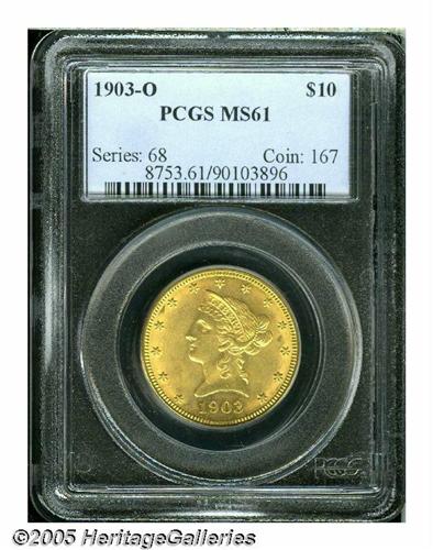 <B>1903-O<$10> MS61 PCGS.</B></I> Bright surfaces display deep yellow-gold color over each side. The design elements are sharply impressed, showing just a touch of softness in the hair over Liberty's ear, as is typical for the issue. A few minute contact marks are visible on Liberty's cheek and neck, and in the lower right (facing) obverse field. This O-mint representative is nicer that the designated grade would imply.