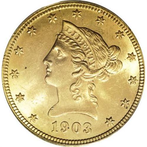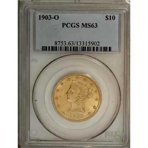 <B>1903-O $10 MS63 PCGS.</B></I> Beyond the MS63 level few 1903-O eagles are available for purchase. This strongly defined and lustrous example has claims to a higher grade and is sure to see active bidding from collectors and dealers alike. Apricot-gold coloration is evenly dispersed on both the obverse and reverse. Population: 78 in 63, 9 finer (12/07).<BR><BR><B>Coin Engraver:</B> Christian Gobrecht<BR><BR><b>Shipping:</b> Coins & Currency (<a target="_blank" href="http://www.heritageauctions.com/common/shipping.php">view shipping information</a>)