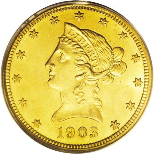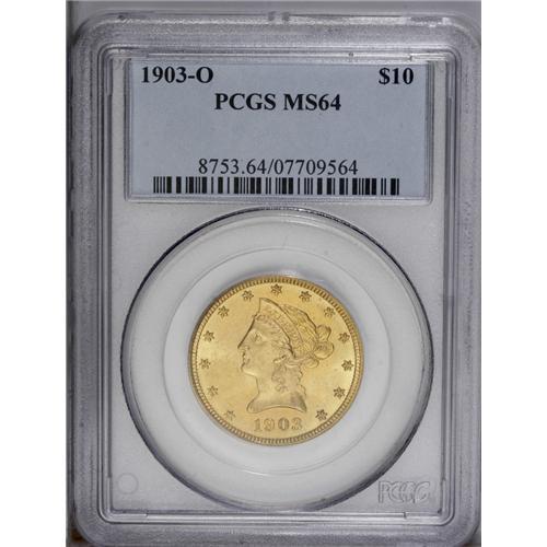<B>1903-O<$10> MS64 PCGS.</B></I> Lustrous yellow-gold with frosty surfaces and sharp design features. This is an important opportunity as the issue is rare as an MS64, and extremely rare any finer, as indicated by the combined population figures. Only 112,771 examples were coined, and this issue represents one of few coinage issues for the New Orleans Mint in 1903. Indeed, the eagle was the only gold denomination produced at the Southern Mint during the year. Population: 10 in 64, 1 finer (7/06).
