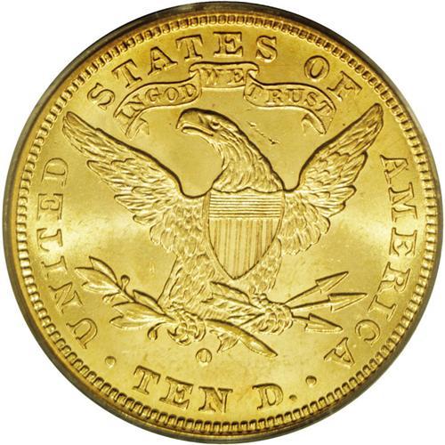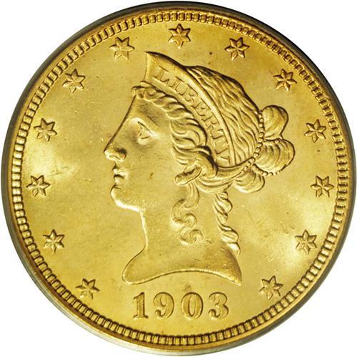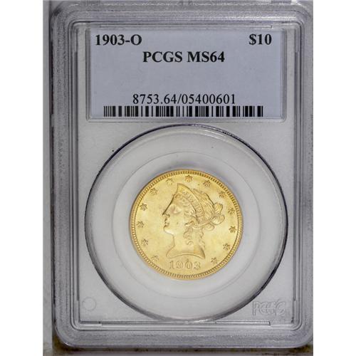 <B>1903-O<$10> MS64 PCGS.</B></I> The exceedingly flashy, scintillating luster is the first attribute one notices on this lovely coin. Next one notes the bold strike, essentially full in all areas, save perhaps on Liberty's eyebrow and the hair immediately above. Finally, one notices a remarkable lack of abrasions, with the few seen confirming the grade assessment--but leaving the impression that this is another high-end, conservatively graded piece. Population: 6 in 64, 1 finer (3/06). <BR><BR><B>Important notice:</B> Heritage usually auctions material at the rate of 200-250 lots per hour. On some occasions eBay Live bid software or the Internet may not be able to keep up with the pace of the auction. We recommend placing a realistic absentee bid now as insurance to avoid disappointment. Occasionally the auctioneer may eliminate or reject an eBay Live bid, and the auctioneer may also reopen a lot after the close of the eBay live bidding (usually because we missed an audience bid), and may reject your bid even if it shows you as the winning bidder. By bidding via eBay Live, you agree that Heritage may award the lot to another bidder at its sole discretion under the circumstances described above or any other reasonable circumstances. Since eBay bids are not shown to us until we open the lot on the floor, we treat those bids just like floor bids. In most cases the floor responds before the eBay bid is presented to us, due to Internet lag time, so for consistency we have made it a policy that floor bids are always considered first over tie eBay live bids. Also please note that all Heritage lots purchased through eBay Live carry a 20% Buyer's Premium. Please make sure you read the Terms and Conditions before you bid. This lot is being auctioned in conjunction with a live floor auction by Heritage Galleries & Auctioneers. All final auction and invoice information will be supplied by Heritage Galleries & Auctioneers, and all other information should be considered preliminary. Lot:4076 <BR><BR><B>Winning Notification and Billing:</B> After the FINAL session in this auction is complete, Heritage will send e-mail and snail mail invoices. This process normally takes several days. All final auction and invoice information will be supplied by Heritage Galleries & Auctioneers, and all other information should be considered preliminary. <BR><BR>This auction will be conducted on a live auction floor and over the Internet through eBay Live. If you choose to place an absentee bid, please take a moment to <font color='#0000ff'><u><a href='http://pages.ebay.com/liveauctions/help/before/laabsentee.html'>learn how eBay Live absentee bidding works</a></u></font><font color='#000000'>