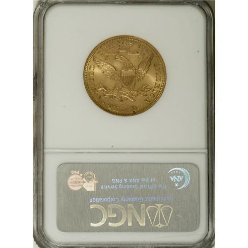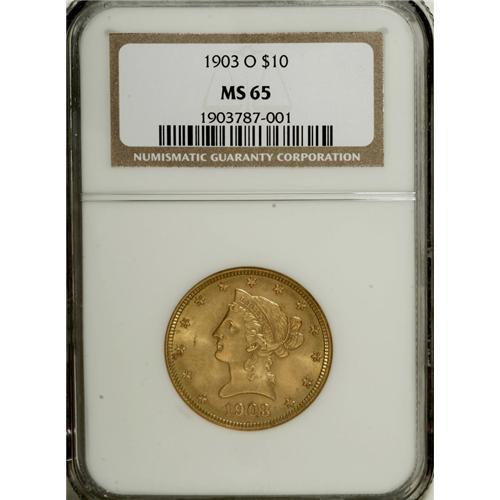 <B>1903-O $10 MS65 NGC.</B></I> This piece is the single finest example of the date that has been certified by NGC, while PCGS has only certified one finer coin, an MS66. In fact, the NGC MS65 and the PCGS MS66 are the only two coins that either service has handled in grades finer than MS64! An important condition-rarity, we feel that this coin could realize a runaway price. Both sides are sharply detailed with frosty yellow and olive-gold luster. The surfaces are nearly pristine with only a few tiny spots and imperfections. This piece is the first Gem we have offered in any of our sales since record-keeping commenced in 1993. Census: 1 in 65, 0 finer (4/07).<BR><BR><b>Shipping:</b> Coins & Currency (<a target="_blank" href="http://www.heritageauctions.com/common/shipping.php">view shipping information</a>)