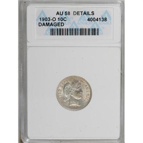<B>1903-O 10C --Damaged--ANACS. AU58 Details.</B></I> NGC Census: (20/63). PCGS Population (20/76). Mintage: 8,180,000. Numismedia Wsl. Price for NGC/PCGS coin in AU58: $117. (#4831)<BR><BR><B>Coin Engraver:</B> Charles E. Barber<BR><BR><b>Shipping:</b> Coins & Currency (<a target="_blank" href="http://www.heritageauctions.com/common/shipping.php">view shipping information</a>)