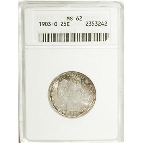 <B>1903-O 25C MS62 ANACS.</B></I> NGC Census: (7/25). PCGS Population (8/48). Mintage: 3,500,000. Numismedia Wsl. Price for NGC/PCGS coin in MS62: $550. (#5635)<BR><BR><B>Coin Engraver:</B> Charles E. Barber<BR><BR><b>Shipping:</b> Coins & Currency (<a target="_blank" href="http://www.heritageauctions.com/common/shipping.php">view shipping information</a>)