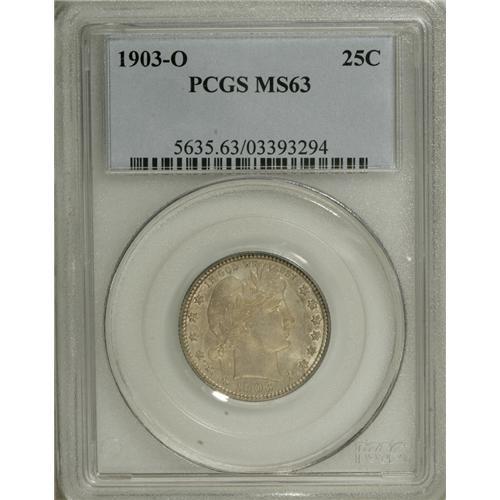 <B>1903-O 25C MS63 PCGS.</B></I> Chestnut and olive intermingle across this shimmering New Orleans Barber quarter. Well struck save for minor blending on the fletchings. Only the faintest slide marks on the cheek limit the grade. Population: 16 in 63, 31 finer (1/07).<BR><BR><b>Shipping:</b> Coins & Currency (<a target="_blank" href="http://www.heritageauctions.com/common/shipping.php">view shipping information</a>)