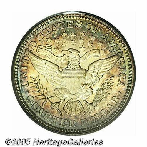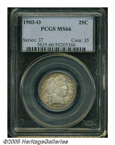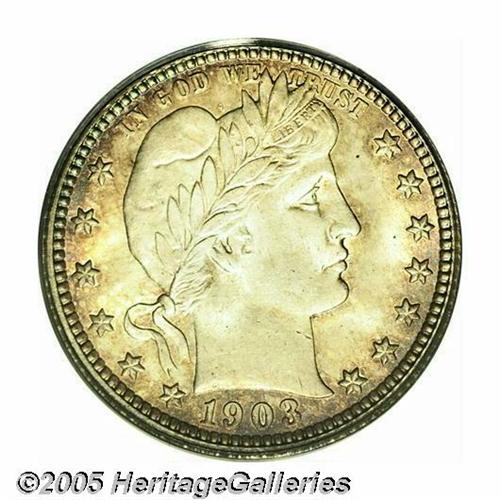 <B>1903-O<25C> MS66 PCGS.</B></I> Although minted in fairly substantial numbers, very few 1903-O Quarters have survived in Mint State, fewer still in Gem and better grades. This piece exhibits full creamy luster underneath reddish-golden toning that deepens toward the rims. Flashes of iridescent blue color are also noted on the reverse. Population: 2 in 66, 1 finer (5/05).