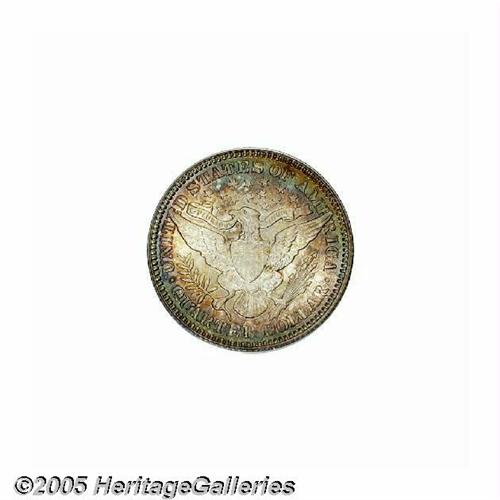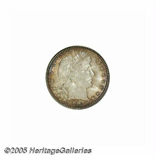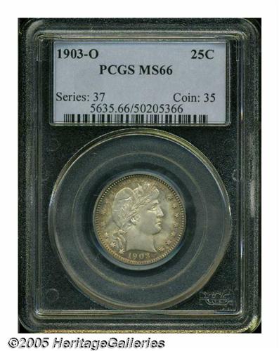 <B>1903-O<25C> MS66 PCGS.</B></I> Although minted in fairly substantial numbers, very few 1903-O Quarters have survived in Mint State, fewer still in Gem and better grades. This piece exhibits full creamy luster underneath reddish-golden toning that deepens toward the rims. Flashes of iridescent blue color are also noted on the reverse which make this coin quite attractive indeed. Identifiable by a couple of tiny ticks near the top of Liberty's neck, just below her chin, and another on the reverse feathers just below the base point of the shield. Well struck, and very nearly perfect with just a hint of weakness on the uppermost arrow feathers in the claw, bold elsewhere. A superlative coin for the specialist. The combined NGC and PCGS Population reports tally three coins graded this high with a single coin seen finer of this date.