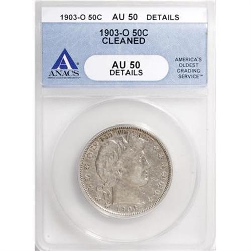 <B>1903-O 50C --Cleaned--ANACS. AU50 Details.</B></I> NGC Census: (3/88). PCGS Population (8/103). Mintage: 2,100,000. Numismedia Wsl. Price for NGC/PCGS coin in AU50: $279. (#6496)<BR><BR><B>Coin Engraver:</B> Charles E. Barber<BR><BR><b>Shipping:</b> Coins & Currency (<a target="_blank" href="http://www.heritageauctions.com/common/shipping.php">view shipping information</a>)