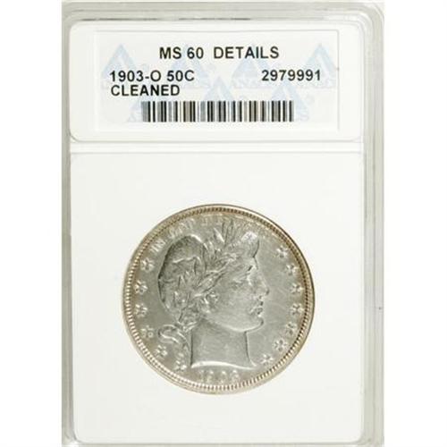 <B>1903-O 50C --Cleaned--ANACS. MS60 Details.</B></I> NGC Census: (1/73). PCGS Population (0/78). Mintage: 2,100,000. Numismedia Wsl. Price for NGC/PCGS coin in MS60: $600. (#6496)<BR><BR><B>Coin Engraver:</B> Charles E. Barber<BR><BR><b>Shipping:</b> Coins & Currency (<a target="_blank" href="http://www.heritageauctions.com/common/shipping.php">view shipping information</a>)