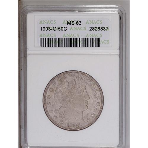 <B>1903-O<50C> MS63 ANACS.</B></I> The satiny obverse offers rich pearl-gray toning, and the brilliant reverse is lustrous and undisturbed. The obverse border has a curious imperfection from 11 to 1 o'clock, and should be personally examined by prospective bidders. Scarce in Mint State.