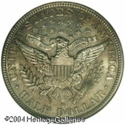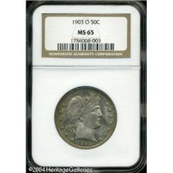 1903-O 50C MS65 NGC. A smooth, satiny-textured Gem <B>1903-O 50C MS65 NGC.</B></I> A smooth, satiny-textured Gem that is lightly toned in speckled golden-tan and champagne coloration. Flashes of mint-green color are also seen about the few of the obverse stars, and near some of the reverse peripheries. Although the mintage of this issue is fairly sizeable, at over 2 million pieces, high grade survivors are rarely encountered. Population: 9 in 65, 3 finer (10/04). <BR><BR><B>Important notice:</B> Heritage usually auctions material at the rate of 200-250 lots per hour. On some occasions eBay Live bid software or the Internet may not be able to keep up with the pace of the auction. We recommend placing a realistic absentee bid now as insurance to avoid disappointment. Occasionally the auctioneer may eliminate or reject an eBay Live bid, and the auctioneer may also reopen a lot after the close of the eBay live bidding (usually because we missed an audience bid), and may reject your bid even if it shows you as the winning bidder. By bidding via eBay Live, you agree that Heritage may award the lot to another bidder at its sole discretion under the circumstances described above or any other reasonable circumstances. Since eBay bids are not shown to us until we open the lot on the floor, we treat those bids just like floor bids. In most cases the floor responds before the eBay bid is presented to us, due to Internet lag time, so for consistency we have made it a policy that floor bids are always considered first over tie eBay live bids. Also please note that all Heritage lots purchased through eBay Live carry a 20% Buyer's Premium. Please make sure you read the Terms and Conditions before you bid. This lot is being auctioned in conjunction with a live floor auction by Heritage Galleries & Auctioneers. All final auction and invoice information will be supplied by Heritage Galleries & Auctioneers, and all other information should be considered preliminary. Lot:6126
