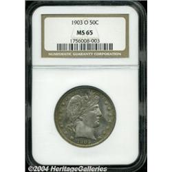 <B>1903-O<50C> MS65 NGC.</B></I> A smooth, satiny-textured Gem that is lightly toned in speckled golden-orange and lilac shades. Flashes of mint-green color are also seen about the few of the obverse stars. Although the mintage of this issue is fairly sizeable, over 2 million pieces, high grade survivors are rarely encountered. Population: 9 in 65, 4 finer (7/04). <BR><BR><B>Important notice:</B> Heritage usually auctions material at the rate of 200-250 lots per hour. On some occasions eBay Live bid software or the Internet may not be able to keep up with the pace of the auction. We recommend placing a realistic absentee bid now as insurance to avoid disappointment. Occasionally the auctioneer may eliminate or reject an eBay Live bid, and the auctioneer may also reopen a lot after the close of the eBay live bidding (usually because we missed an audience bid), and may reject your bid even if it shows you as the winning bidder. By bidding via eBay Live, you agree that Heritage may award the lot to another bidder at its sole discretion under the circumstances described above or any other reasonable circumstances. Since eBay bids are not shown to us until we open the lot on the floor, we treat those bids just like floor bids. In most cases the floor responds before the eBay bid is presented to us, due to Internet lag time, so for consistency we have made it a policy that floor bids are always considered first over tie eBay live bids. Also please note that all Heritage lots purchased through eBay Live carry a 20% Buyer's Premium. Please make sure you read the Terms and Conditions before you bid. </span></font></tr></table></td></tr></table>