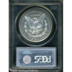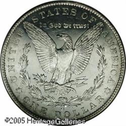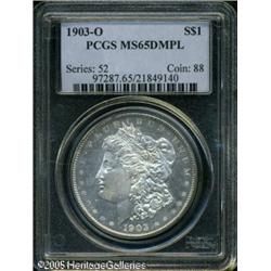 <B>1903-O<img border='0' src='http://www.heritagecoins.com/images/star.gif' width=10 height=10>$1 MS65 Deep Mirror Prooflike PCGS.</B></I> Here is a very difficult coin to locate with the Deep Mirror Prooflike surfaces, and particularly so in Gem grades. Note the mirror like fields which offset the frosted devices, and especially the quality of the surfaces. Identifiable by a small nick right in the middle of Liberty's broad cheek, and by the outstanding quality for this date, which is virtually unheard of for a 1903-O Morgan dollar. White in color save for a whisper of gold starting to form on the obverse rim. Truly an exceptional opportunity for the specialist who is assembling a set of these in Deep Prooflike condition. The combined NGC and PCGS Population Reports show 11 graded this high with a scant three graded finer. Lot:10618