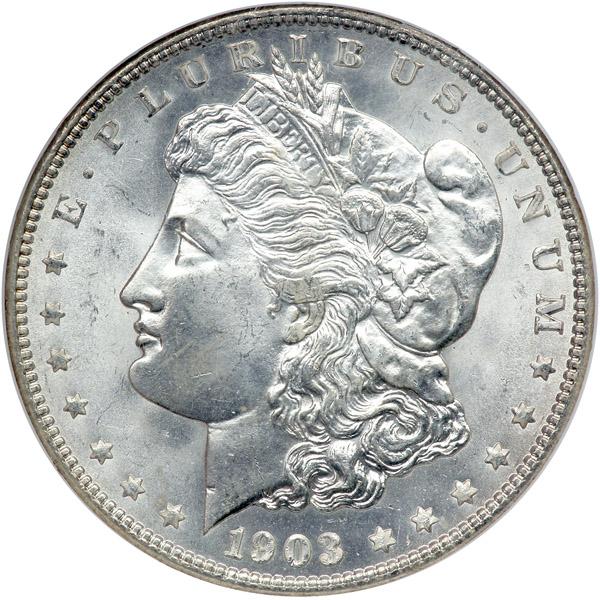 1903-O Morgan Dollar. NGC graded MS-65. A satiny white gem, the luster booming over every surface. Finely detailed, too. A beautiful Gem BU (PCGS # 7286) .