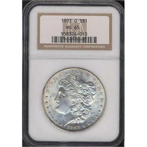 <b>1903-O Morgan Dollar. NGC graded MS65.</b> A tiny scuff in the frost and a hairline at the eyebrow. Pleasant satin envelops all surfaces under its silvery radiance, with no toning. Given the proper amount of strike pressure, the coin was fully brought up by the dies. In the 1960s and before, the 1903-O was a great rarity, with only an occasional circulation quality coin offered for sale. BU's were priced at around $1500, when available. Then, the situation reverse when several bags of fresh Uncirculated 1903-O dollars turned up in the government hoard that was released in 1962-64. Today these are affordable, but still carry the aura of rarity and the long-felt charisma of the year and mint <b>(PCGS # 7286)</b>