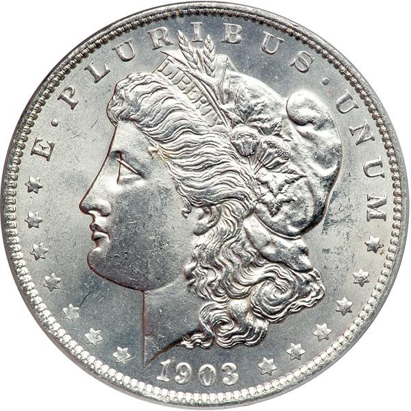 1903-O Morgan Dollar. PCGS graded MS-63. A nice white coin. Popular because it was once so expensive (PCGS # 7286) .