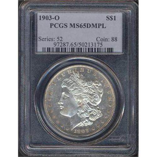 <b>1903-O Morgan Dollar. PCGS graded MS65 DMPL.</b> Bright silver color with a much more than just a "hint" of prooflike reflection; the mirror surface lights up the field on this well struck 1903-O like few others. As such, it is a nicely preserved coin. And as often seen, the imprint that was left by the dies shows strong relief (1903-O dollars tend to be well struck, even the baggy, low-end Mint States); therefore this handsome piece has a wonderful clear sharp impression <b>(PCGS # 97287)</b>