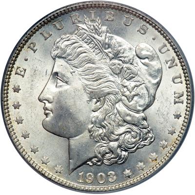 1903-O Morgan Dollar. PCGS graded MS-66. A grand looking coin, a coin that endeavors to earn its high standing in the PCGS rankings by displaying gemmy white surfaces, a strong-looking design, and limited abrasions kept to the bare minimum (PCGS # 7286).