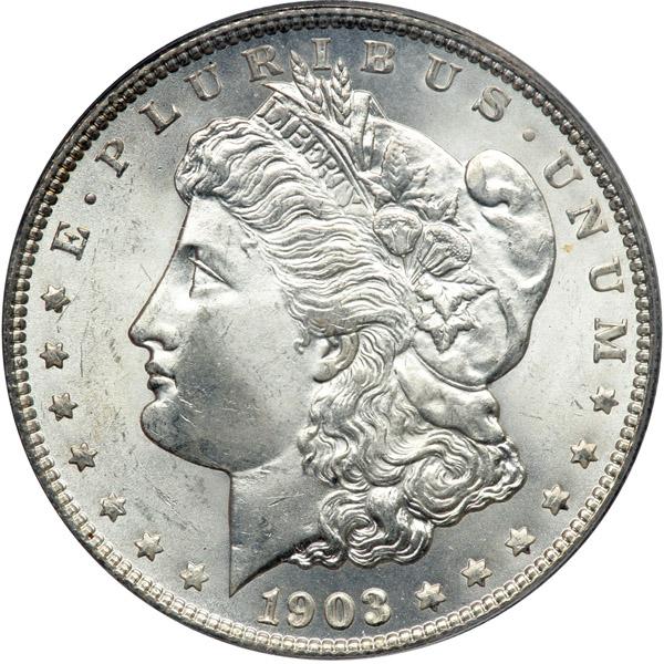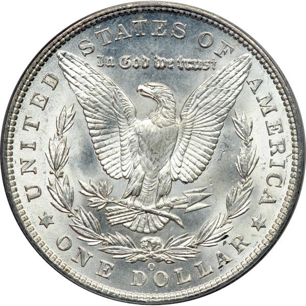 1903-O Morgan Dollar. PCGS graded MS-65. Housed in an Old Green Holder. A nice white satiny Gem. The story of this issue stems not from its present availability, but rather from its past rarity. Prior to the Treasury Raid of 1962-1964, as some like to call it, the 1903-O was the premier condition rarity in the Morgan dollar series. The dispersal of numerous bags from the Treasury Building drastically altered the relative ranking of this O-mint delivery versus others in the series. In worn grades, however, the 1903-O remains an elusive one, and is a close rival to the 1885-CC for top rarity honors among circulated Morgan dollars (PCGS # 7286) .