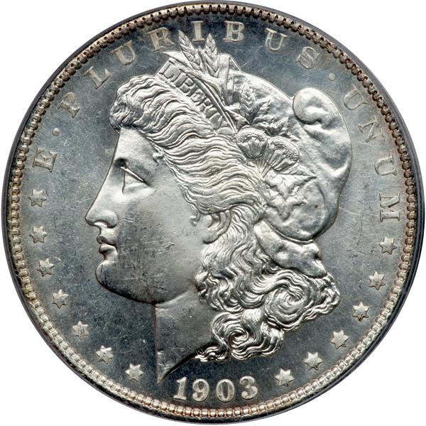 1903-O Morgan Dollar. PCGS graded MS-64 Prooflike PQ. A fresh and satiny, almost wholly mirrored white coin. Great eye-appeal! Pop 44; 20 finer, 17 in 65, 3 in 66 (PCGS # 7287) .