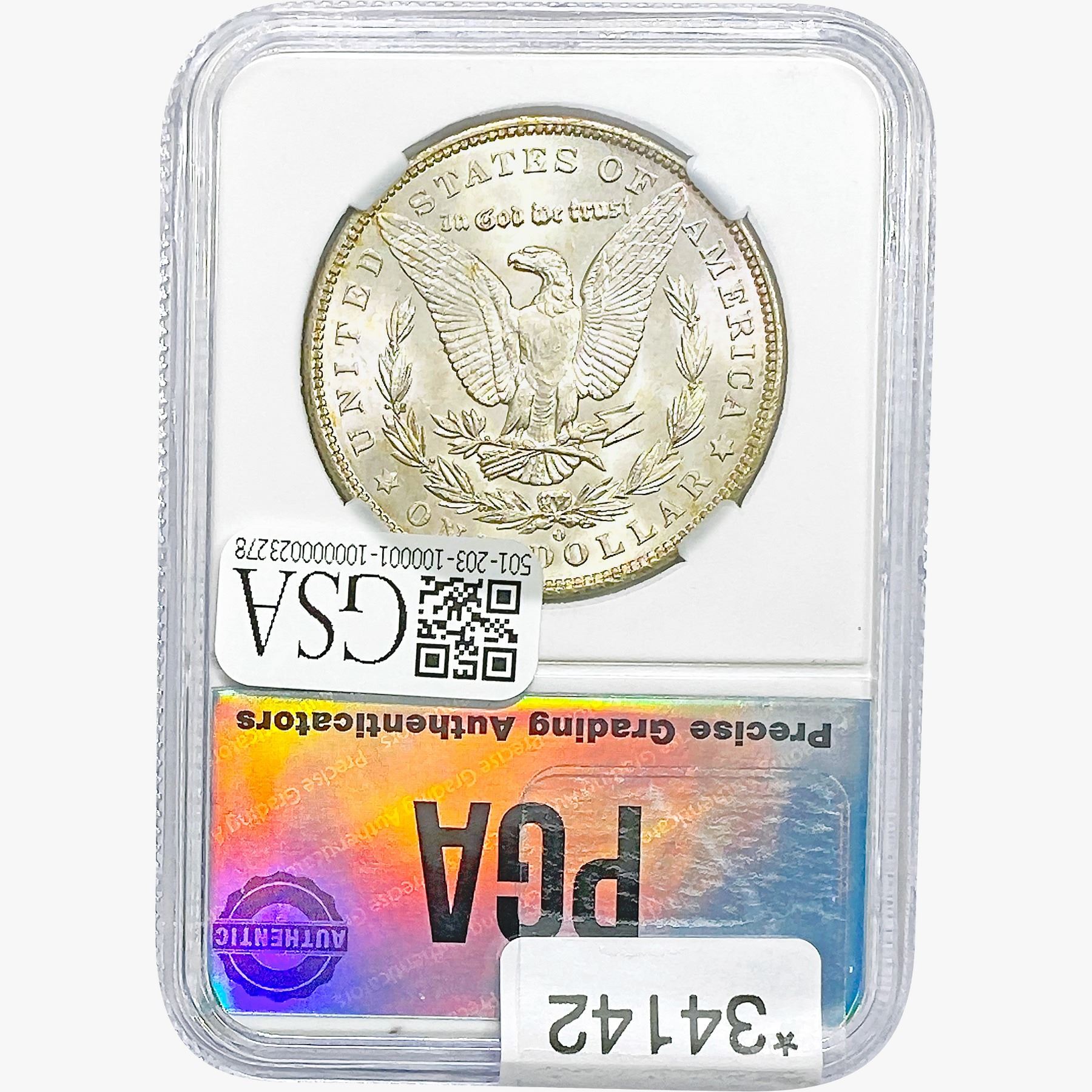 COINS AND CURRENCY LISTED IN GSA’S CATALOG AS GRADED AND ENCAPSULATED BY PCGS, NGC, ANACS, ICG, PCGS CURRENCY, PMG, PCGS BANKNOTE GRADING, CMC OR ANY OTHER THIRD-PARTY GRADING SERVICE ARE LIKEWISE SOLD “AS-IS” EXCEPT AS EXPRESSLY SET FORTH HEREIN. ALL THIRD-PARTY GRADING SERVICE GUARANTEES, INCLUDING AUTHENTICITY, ARE THE SOLE RESPONSIBILITY OF THE THIRD-PARTY GRADING SERVICE AND NOT WARRANTIES OR GUARANTEES OF GSA. BIDDERS SHOULD CONTACT THESE THIRD-PARTY GRADING SERVICES DIRECTLY WITH RESPECT TO ANY CLAIMS OR QUESTIONS THEY MAY HAVE CONCERNING THEIR GUARANTEES AND WARRANTIES. BIDDERS ACKNOWLEDGE AND AGREE THAT AUCTIONEER IS NOT BOUND BY OR LIABLE FOR ANY OPINION OR CERTIFICATION BY ANY THIRD-PARTY GRADING SERVICE. REMOVAL OF A PRODUCT FROM ITS PROTECTIVE CASING OR HOLDER OR ALTERATION OF ANY COIN HOLDER WAIVES ALL RIGHTS CONCERNING THE PRODUCT CONTAINED THEREIN.