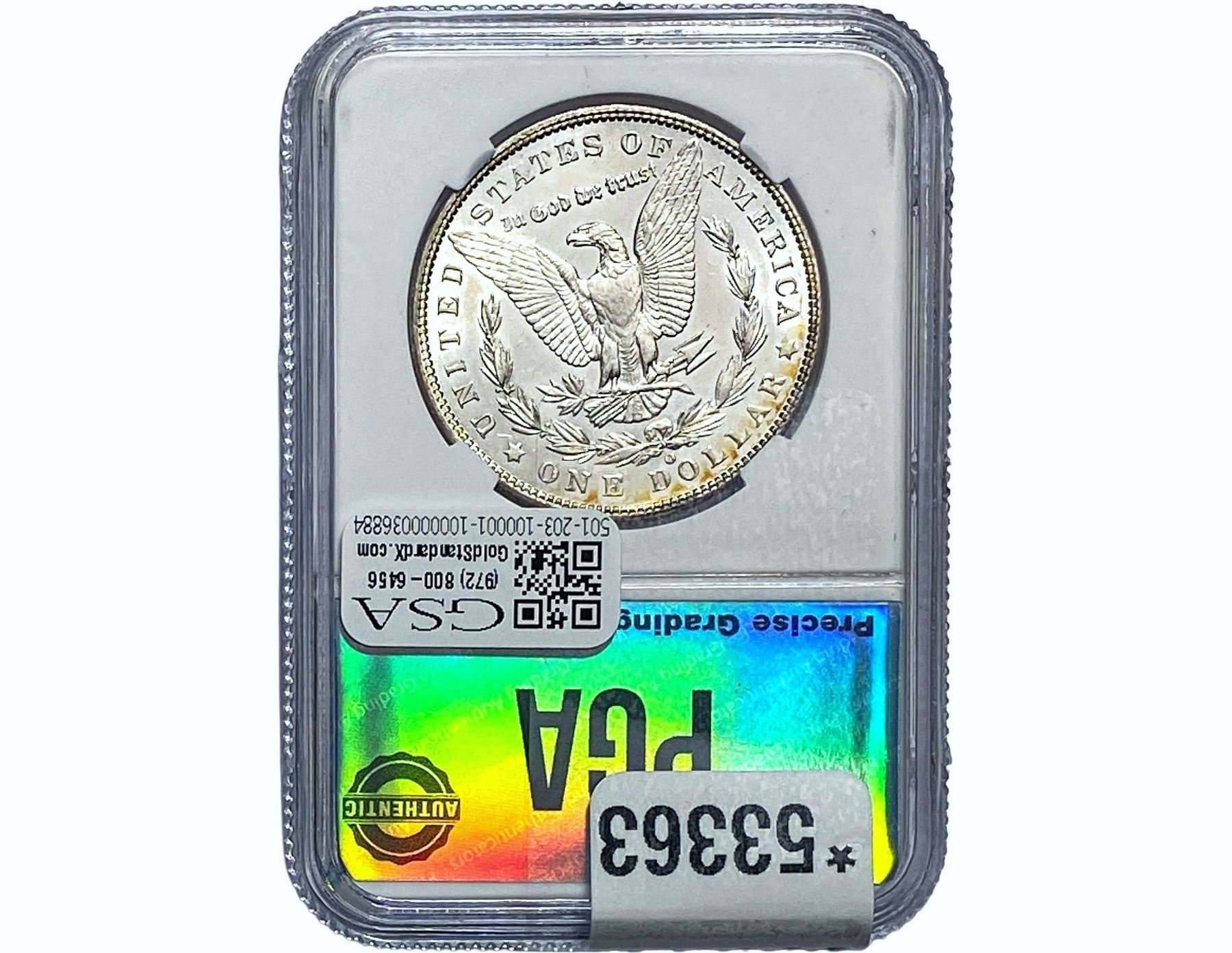 e. Coins sold referencing a third-party grading service are sold “AS IS” without any express or implied warranty, except for a guarantee by GSA that they are genuine. Removal or alteration of the holder, voids all of Bidder’s claims concerning that Product. Certain warranties may be available from the grading services and Bidders are referred to them for further details: Numismatic Guaranty Corporation (NGC), PO Box 4776, Sarasota, FL 34230, www.ngccoin.com/services/writtenguarantee.asp; Professional Coin Grading Services (PCGS), PO Box 9458, Newport Beach, CA 92658, www.pcgs.com/guarantee.html; ANACS, 6555 S. Kenton St., Ste. 303, Englewood, CO 80111; and Independent Coin Grading Co. (ICG), 7901 East Bellview, Ave., Suite 50, Englewood, CO 80111.