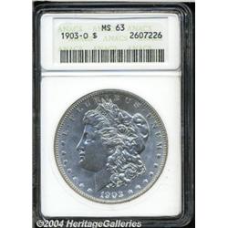 <B>1903-O<S$1> MS63 ANACS.</B></I> Generally nicely struck, fully brilliant, and relatively few marks. Indeed, this example reveals fewer abrasions than what would be expected for the assigned grade.<BR><I>From the Newark Mounds Collection.</B></I> <BR><BR><B>Important notice:</B> Heritage usually auctions material at the rate of 200-250 lots per hour. On some occasions eBay Live bid software or the Internet may not be able to keep up with the pace of the auction. We recommend placing a realistic absentee bid now as insurance to avoid disappointment. Occasionally the auctioneer may eliminate or reject an eBay Live bid, and the auctioneer may also reopen a lot after the close of the eBay live bidding (usually because we missed an audience bid), and may reject your bid even if it shows you as the winning bidder. By bidding via eBay Live, you agree that Heritage may award the lot to another bidder at its sole discretion under the circumstances described above or any other reasonable circumstances. Since eBay bids are not shown to us until we open the lot on the floor, we treat those bids just like floor bids. In most cases the floor responds before the eBay bid is presented to us, due to Internet lag time, so for consistency we have made it a policy that floor bids are always considered first over tie eBay live bids. Also please note that all Heritage lots purchased through eBay Live carry a 20% Buyer's Premium. Please make sure you read the Terms and Conditions before you bid.