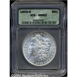 <B>1903-O<S$1> MS63 ICG.</B></I> Virtually untoned and brilliant, this attractive Morgan is sharply struck, save for minor softness in the central areas. A light nick under Liberty's eye apparently limits the grade. <BR><BR><B>Important notice:</B> Heritage usually auctions material at the rate of 200-250 lots per hour. On some occasions eBay Live bid software or the Internet may not be able to keep up with the pace of the auction. We recommend placing a realistic absentee bid now as insurance to avoid disappointment. Occasionally the auctioneer may eliminate or reject an eBay Live bid, and the auctioneer may also reopen a lot after the close of the eBay live bidding (usually because we missed an audience bid), and may reject your bid even if it shows you as the winning bidder. By bidding via eBay Live, you agree that Heritage may award the lot to another bidder at its sole discretion under the circumstances described above or any other reasonable circumstances. Since eBay bids are not shown to us until we open the lot on the floor, we treat those bids just like floor bids. In most cases the floor responds before the eBay bid is presented to us, due to Internet lag time, so for consistency we have made it a policy that floor bids are always considered first over tie eBay live bids. Also please note that all Heritage lots purchased through eBay Live carry a 20% Buyer's Premium. Please make sure you read the Terms and Conditions before you bid.