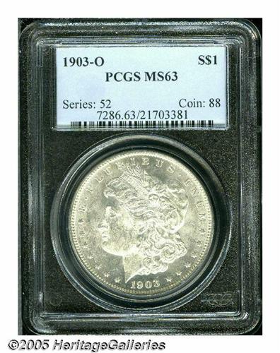 <B>1903-O<S$1> MS63 PCGS.</B></I> A gently toned and lustrous piece. The reverse is refreshingly clean, while the obverse has only minor luster grazes. Once considered a great rarity, the 1903-O emerged in some quantity when the Treasury holding of Silver Dollars was depleted in the early 1960s.